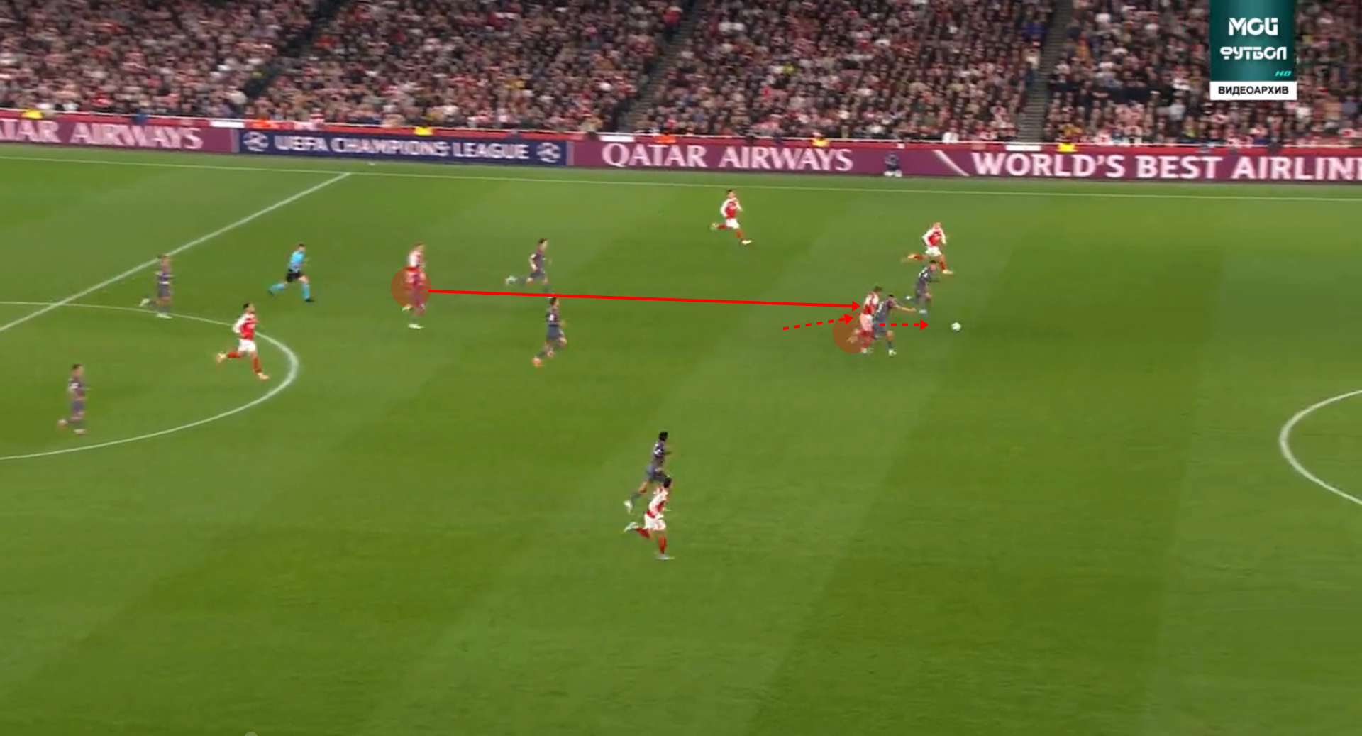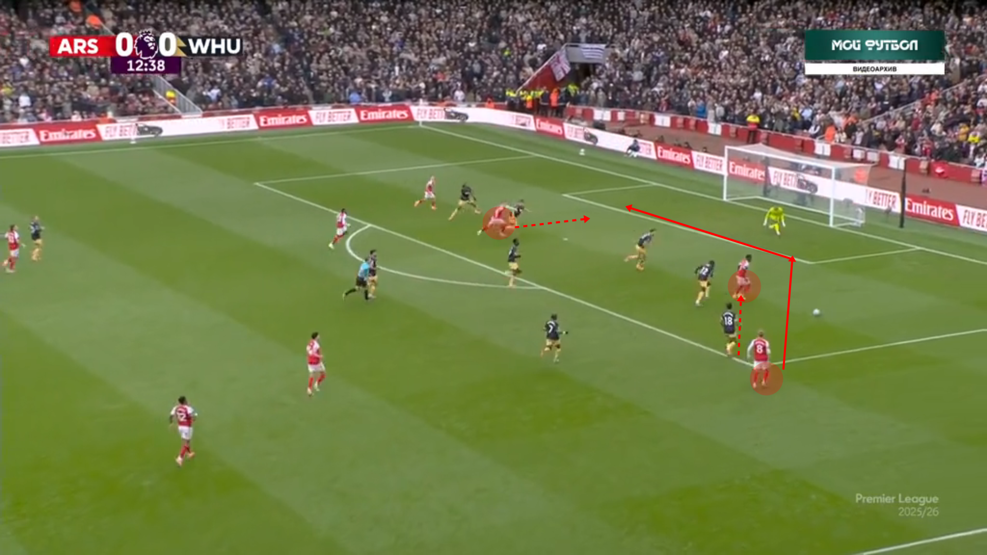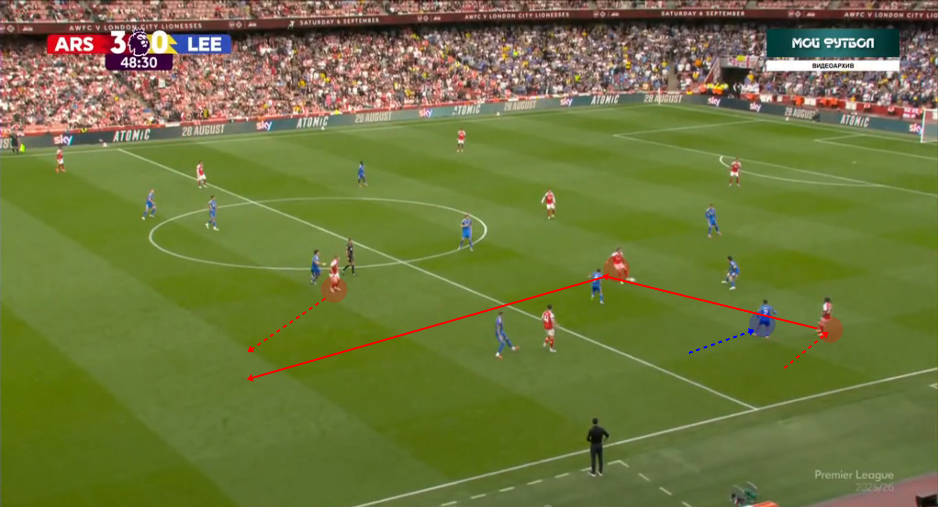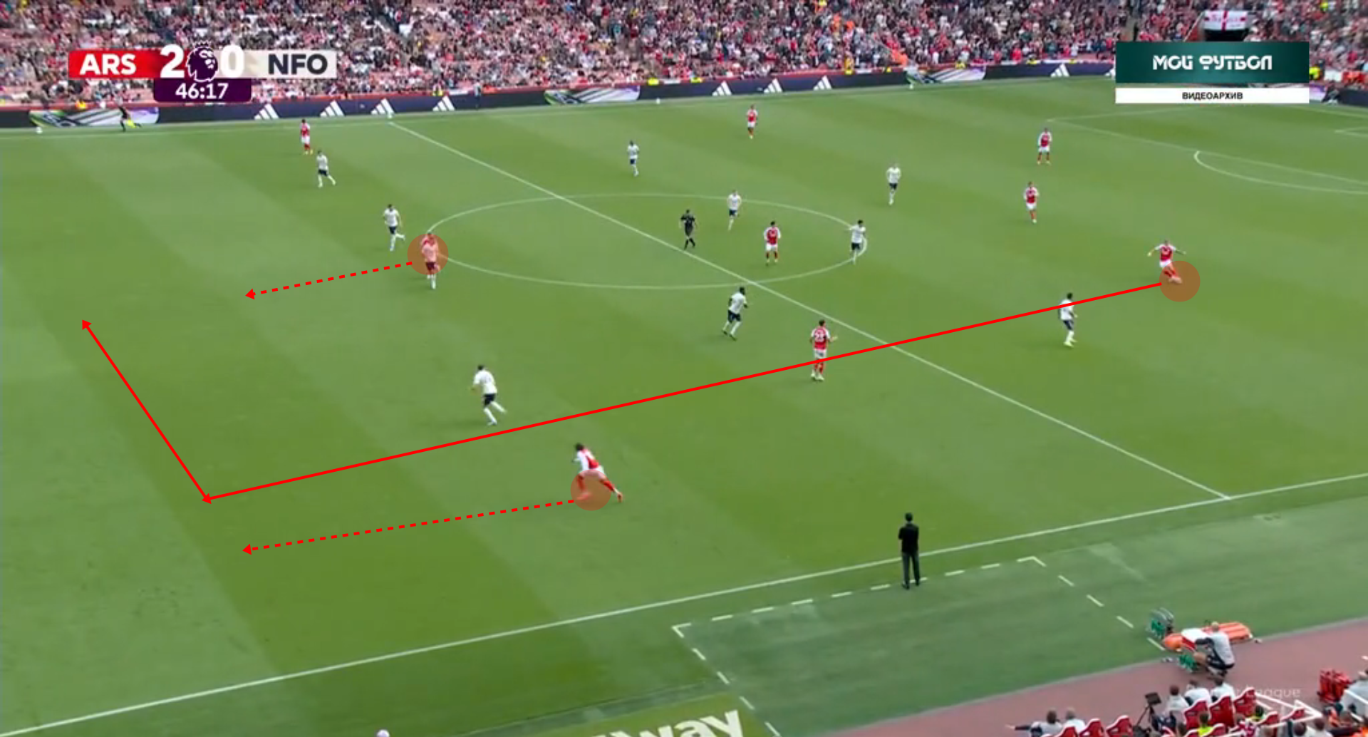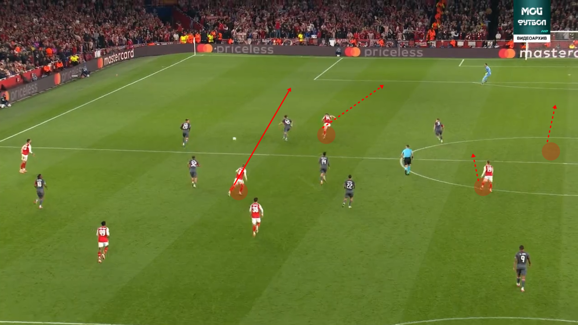 Ami a rendszert illeti, a két szélső (többnyire Trossard és Saka) is a vonal mellett helyezkedik, míg a belső területeken a két középpályás, Rice és a Crystal Palace-tól a nyáron leigazolt Eze helyezkedik az ellenfél védővonalai között. A két szélső hátvéd, Timber és főleg Calafiori – ahogy Arteta Guardiolától tanulta – inkább befelé lépnek támadásban, és amúgy is csak néha futhatnak fel a támadók vonalába.