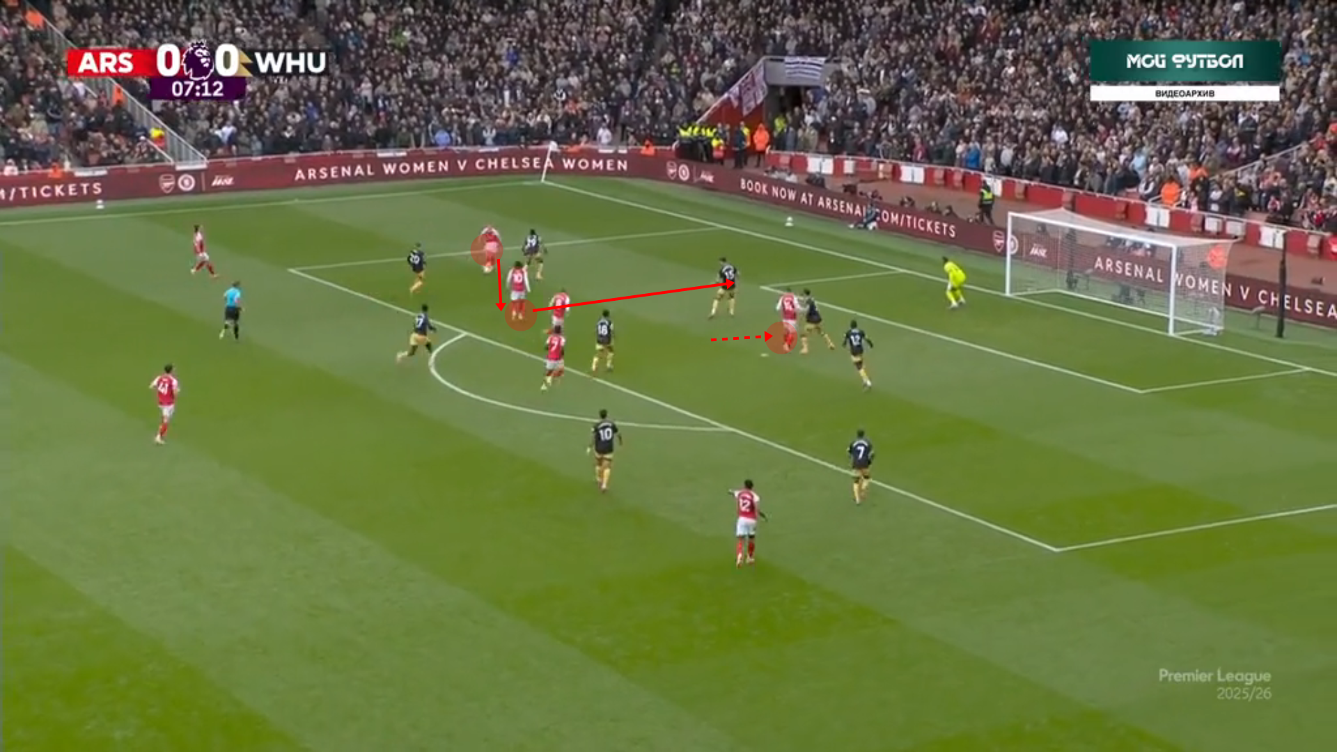 Helyzet a West Ham ellen: Saka átlósan beindul a félterületbe, majd centerez, Gyökeres klasszikus kilencesként érkezik a mélyen ülő védelembe, ám estében nem találja el jól a labdát.