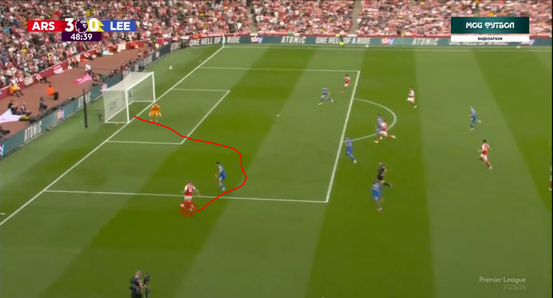 Gyökeres gólja a Leeds ellen: Madueke visszalépve kihúzza a védőt, Calafiori indít, Gyökeres területbe indul. A szélről nem sprintből, hanem befelé cselezve lő gólt. Elmozgó játék, klasszikus szélső nincs, mintha csak Lisszabonban lenne.