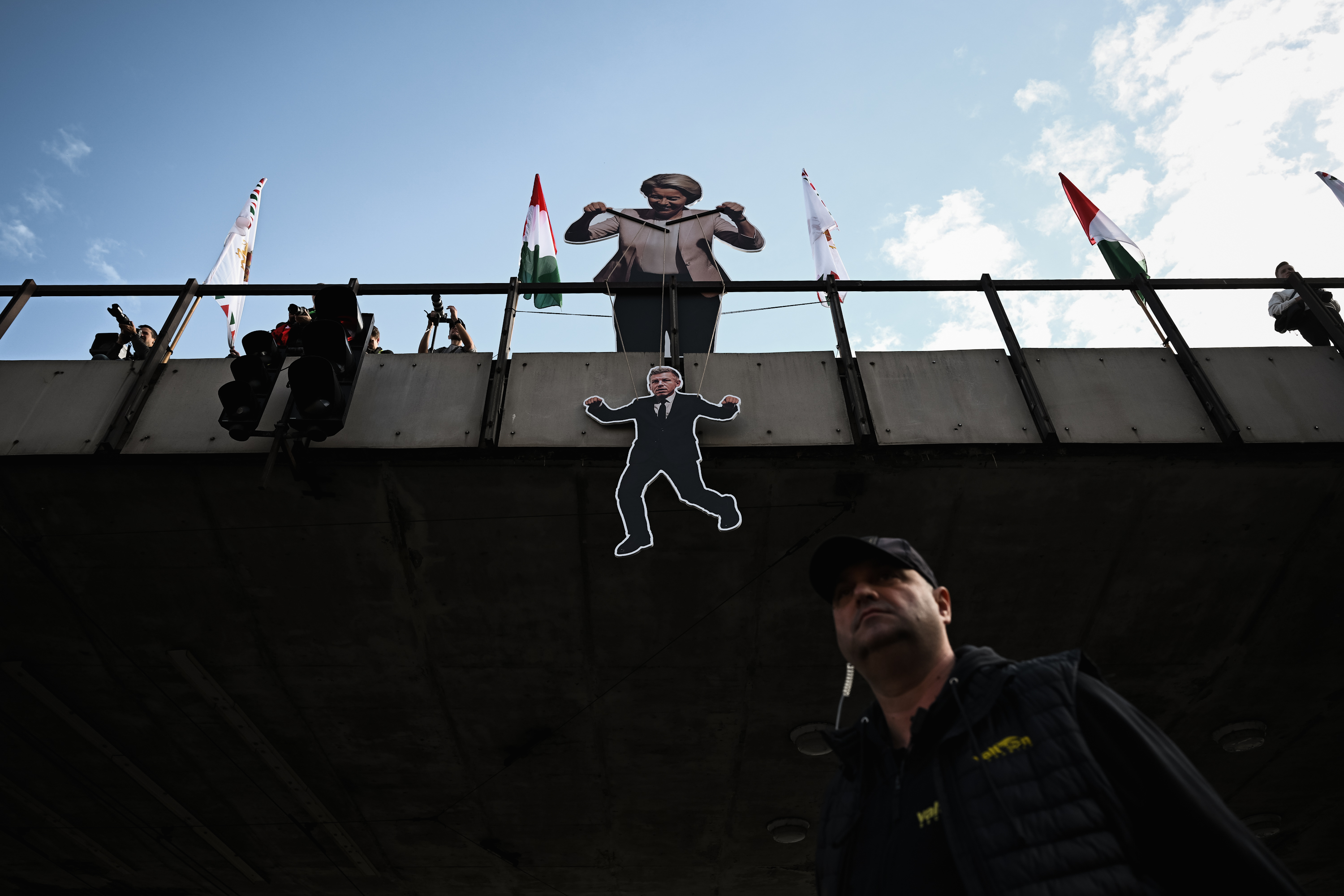 A menet vége is beért a Nyugati téri felüljáróhoz, ahonnan egy nagyméretű karton Ursula von der Leyen lógat le egy kisebb karton Magyar Pétert.