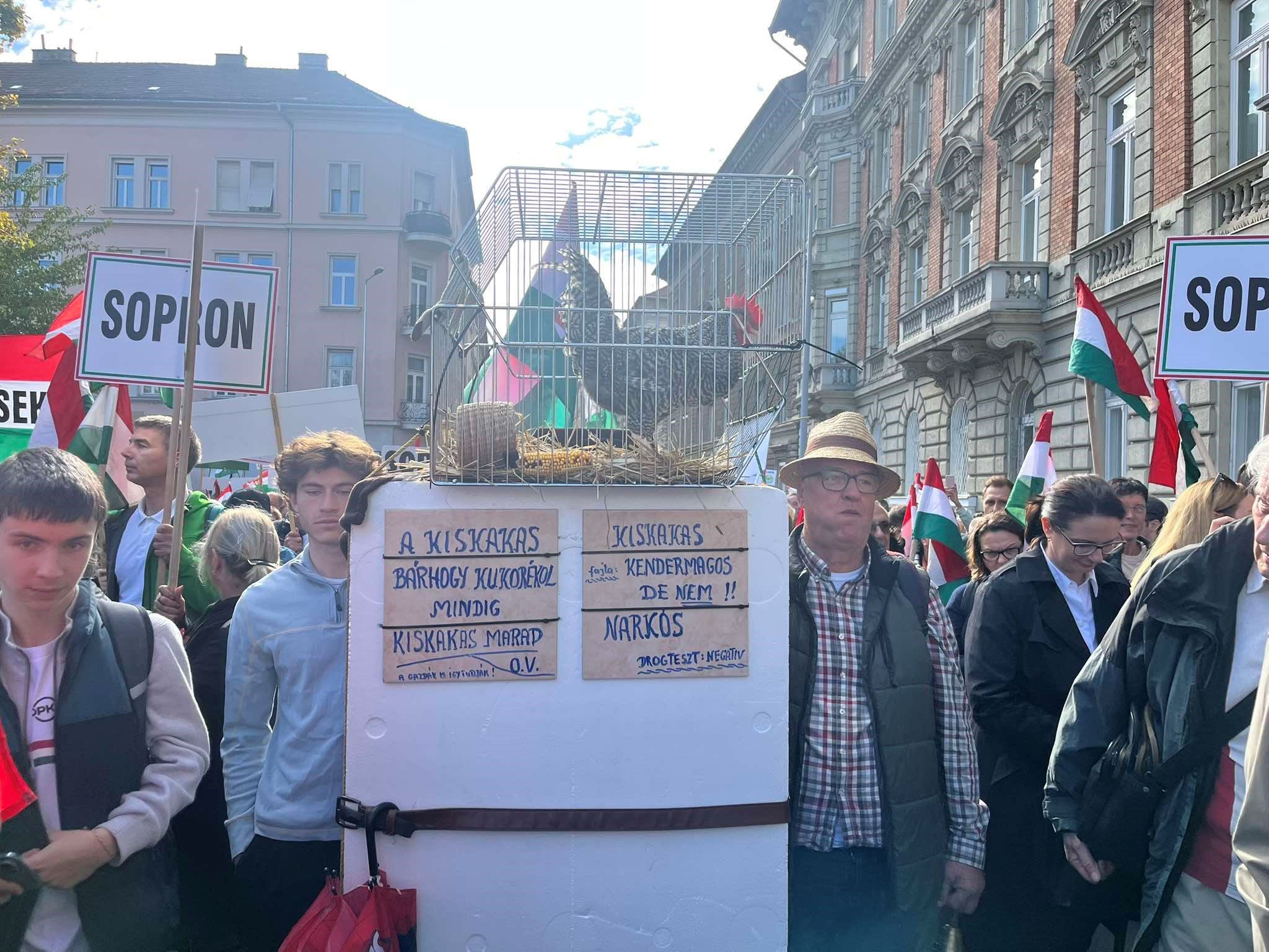 – egy ilyen feliratú táblával kiegészítve a Bem rakparton megjelent egy ketrecbe zárt kakas.